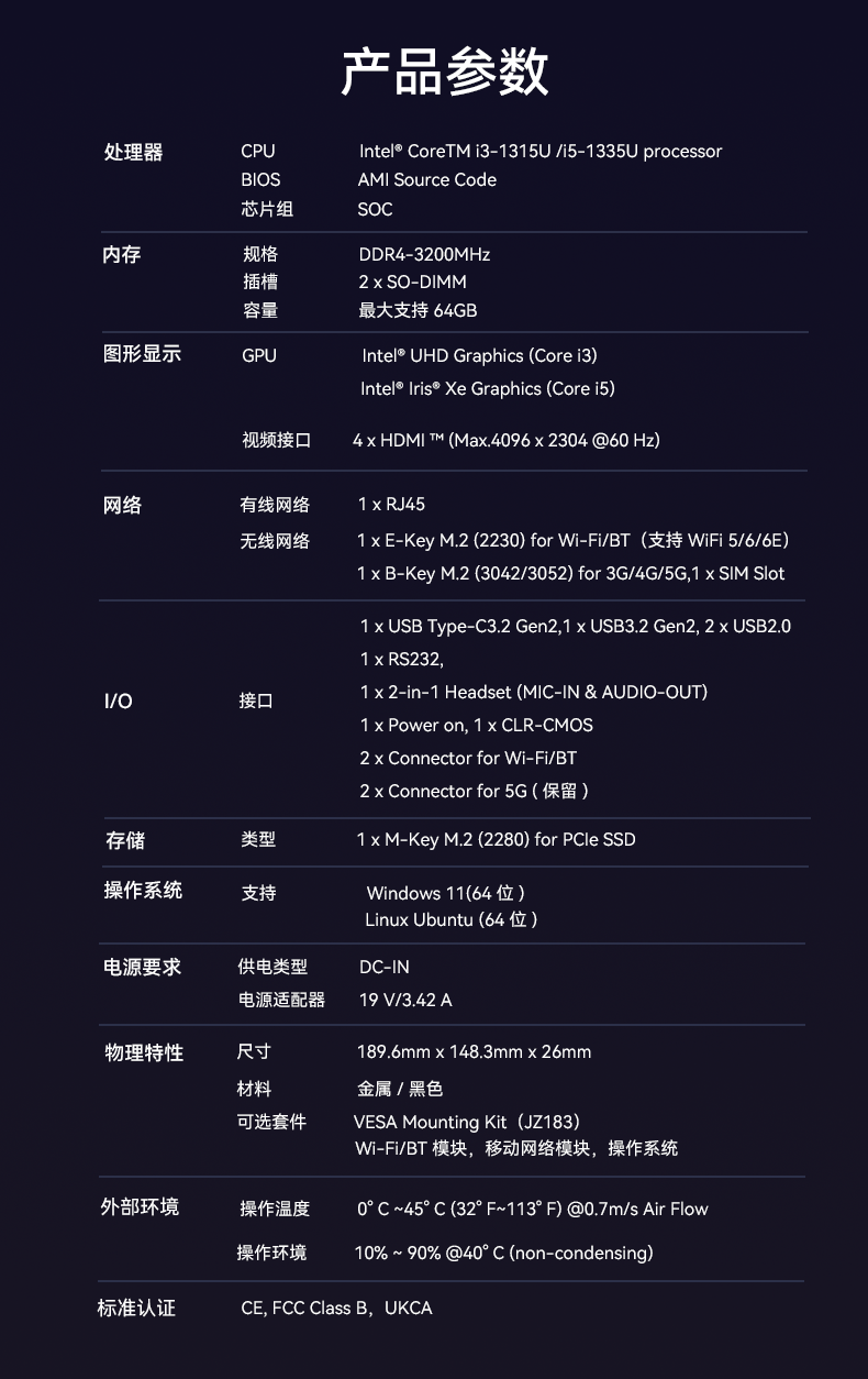 太阳成集团(tyc4633·中国)科技D613采用英特尔Raptor Lake酷睿i3-1315U/i5-1335U 处理器,作为一款性能强悍的主机,它的TDP仅15W,能有效降低能耗,延长电池寿命。在内存方面,D613采用2 x SO-DIMM DDR4-3200 MHz,最大可达64GB,并配备1 x M-Key M.2 (2280) for PCIe SSD。