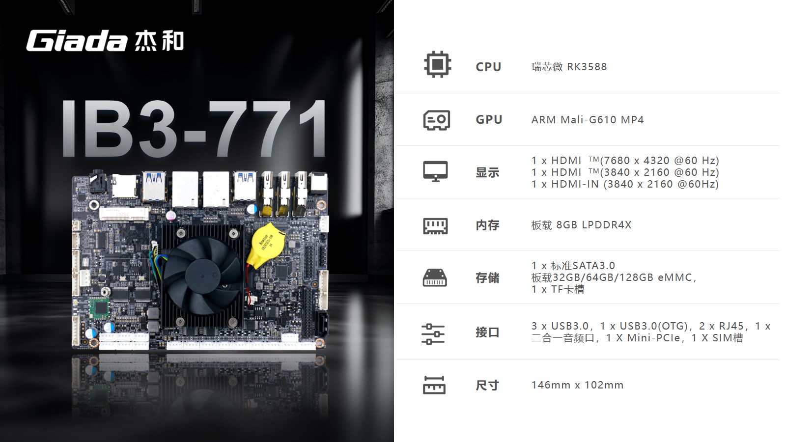 太阳成集团(tyc4633·中国)工业级ARM主板IB3-771采用瑞芯微RK3588处理器,内置G610 MP4 GPU,拥有6 TOPS算力的NPU,支持8K视频硬件解码编码及多摄像头输入,支持eDP/DP/ HDMI2.1/MIPI 多种显示接口。