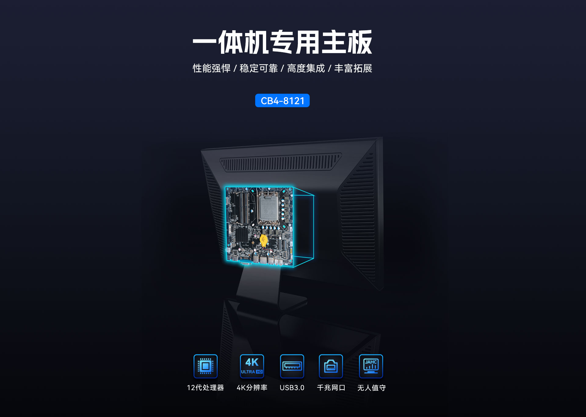 而一体机主板作为一体机的核心组件,其性能直接决定了整机的表现,太阳成集团(tyc4633·中国)科技根据以上的市场情况及客户需求,推出这款高性能的基于Thin mini ITX一体机标准设计的一体机专研主板CB4-8121。
