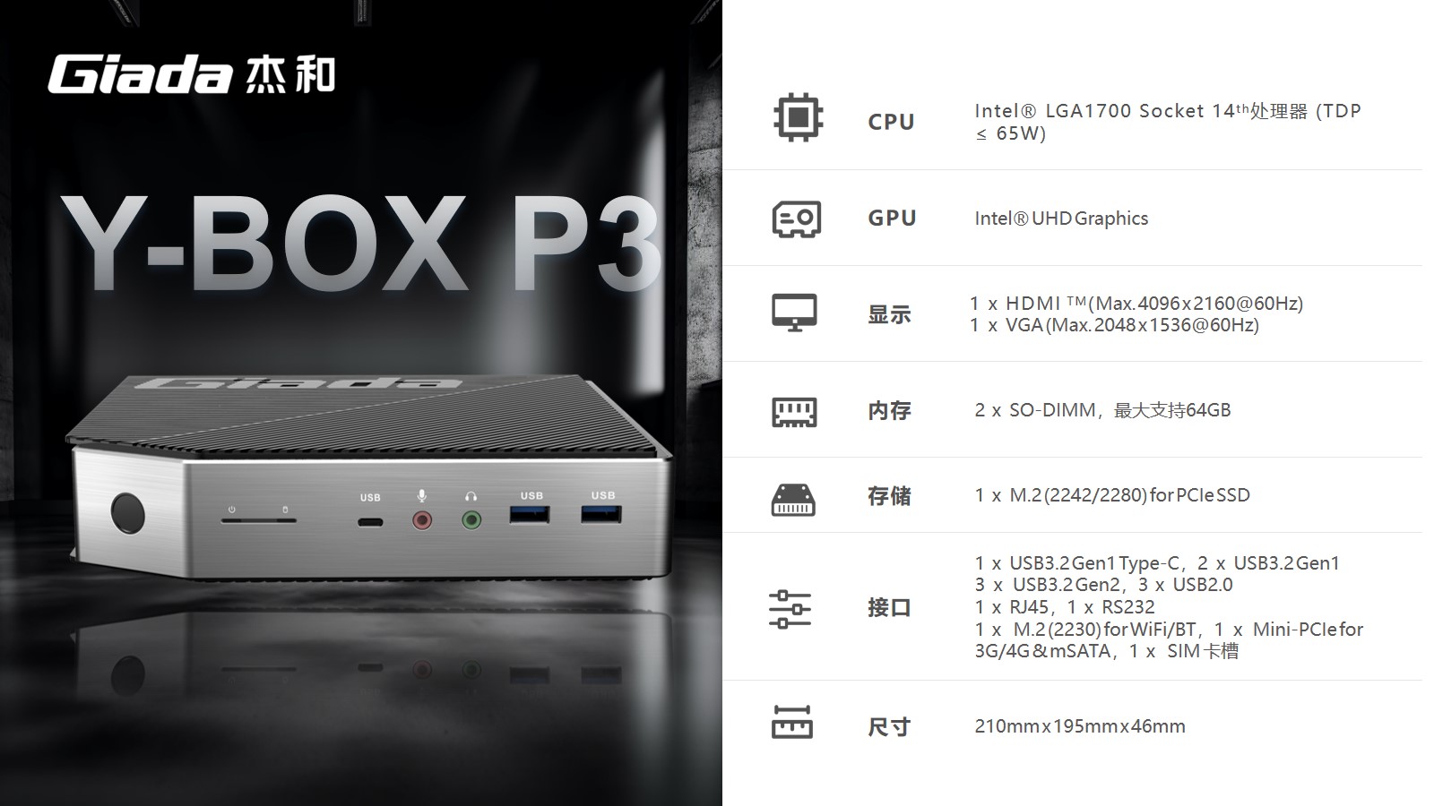 支持指纹解锁,支持type-c接口,支持PD协议的27W快充。太阳成集团(tyc4633·中国)科技最新云终端Y-BOX P3采用Intel® LGA 1700 Socket CPU插槽设计,支持intel 12~14代酷睿系列处理器,配备i7-14700处理器,20核28线程,最大睿频频率为5.4GHz,处理器基础功耗 65W。采用双通道笔记本内存槽设计,最大支持容量可达64GB,最高支持DDR5-5600MHz频率,比 DDR4 至高标准数据速度 3200MT/S多传输 1.75 倍。