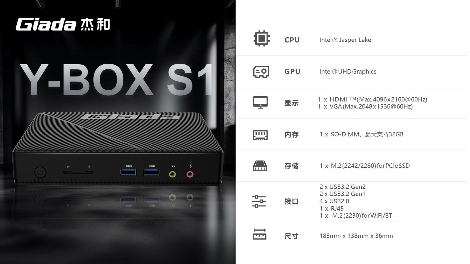 云终端Y-BOX S1采用Intel® Jasper Lake平台,搭载瘦终端主流处理器Intel® Celeron®N5095,1 X SO-DIMM DDR4内存插槽,支持HDMI显示接口,可实现4K超高清内容显示,低功耗,提供高清流畅的桌面体验。