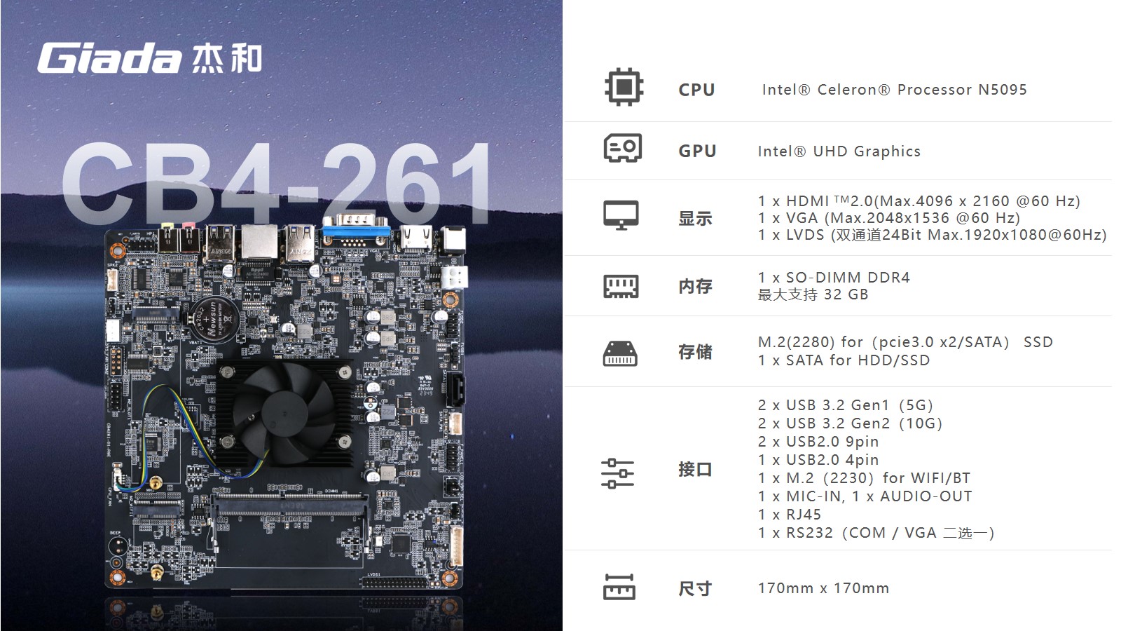 太阳成集团(tyc4633·中国)科技CB4-261尺寸仅有170x170mm,小而精巧。搭载N5095芯片,该芯片采用10nm制程技术,四核心设计,支持Windows 、Linux系统,可满足多种终端机应用场景的需求,如信息查询、基本数据处理等。