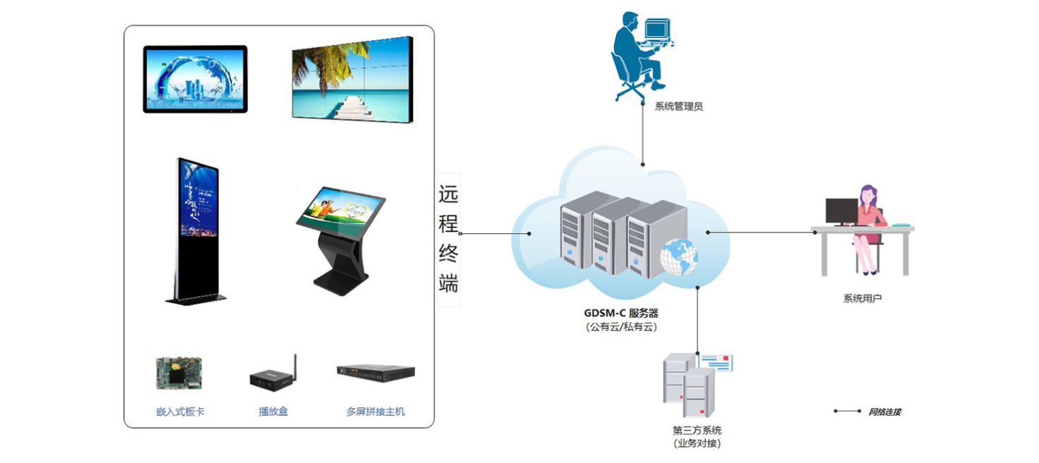 GDSM-C信息发布系统支持公有云和私有云方式部署服务器,系统提供多设备统一管理、多屏拼接、远程发布、远程监控、定时开关机、日志查询等功能。