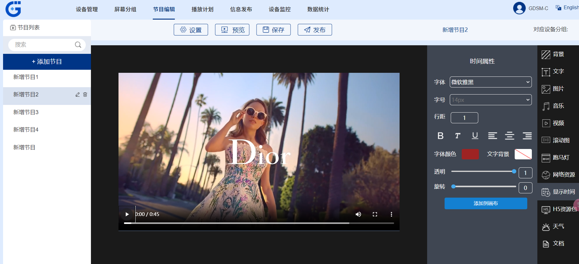 新建好一个节目后,在页面右侧选择素材来完成节目内容的编辑,素材类型可使用网络资源素材(如:链接、背景图/色、天气、时间等)和上传本地素材(如:图片、视频、文档、 H5 等)。