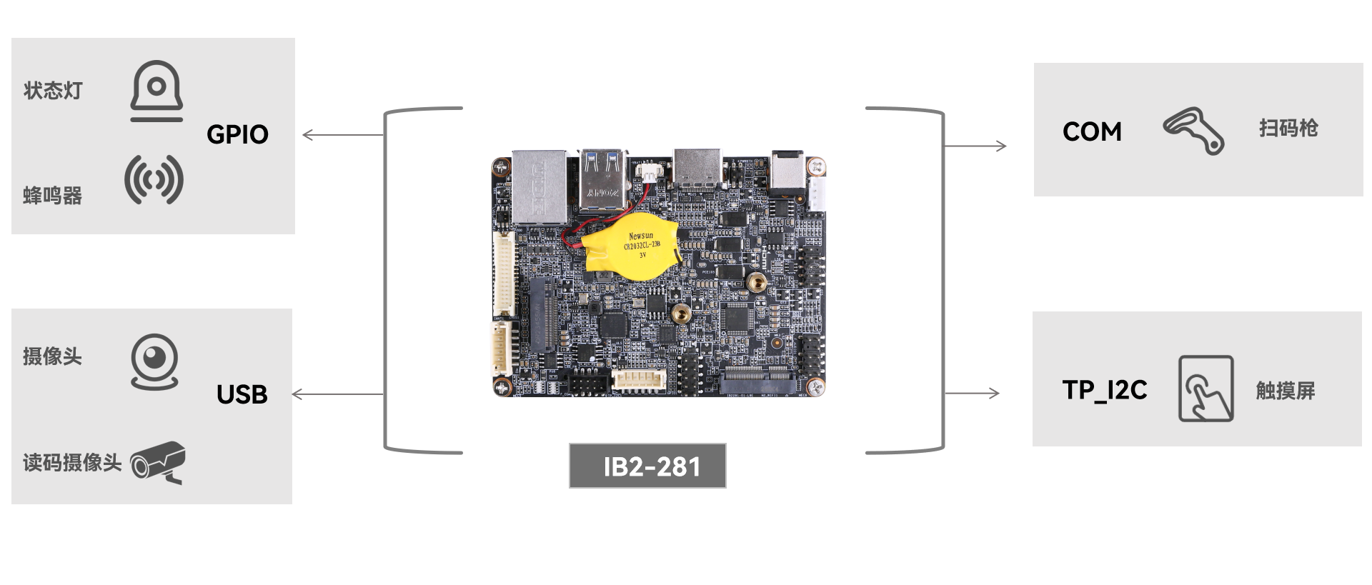 太阳成集团(tyc4633·中国)科技工业主板 IB2-281 提供灵活的主控平台选择与丰富的接口资源,适用于智能分拣系统嵌入应用: