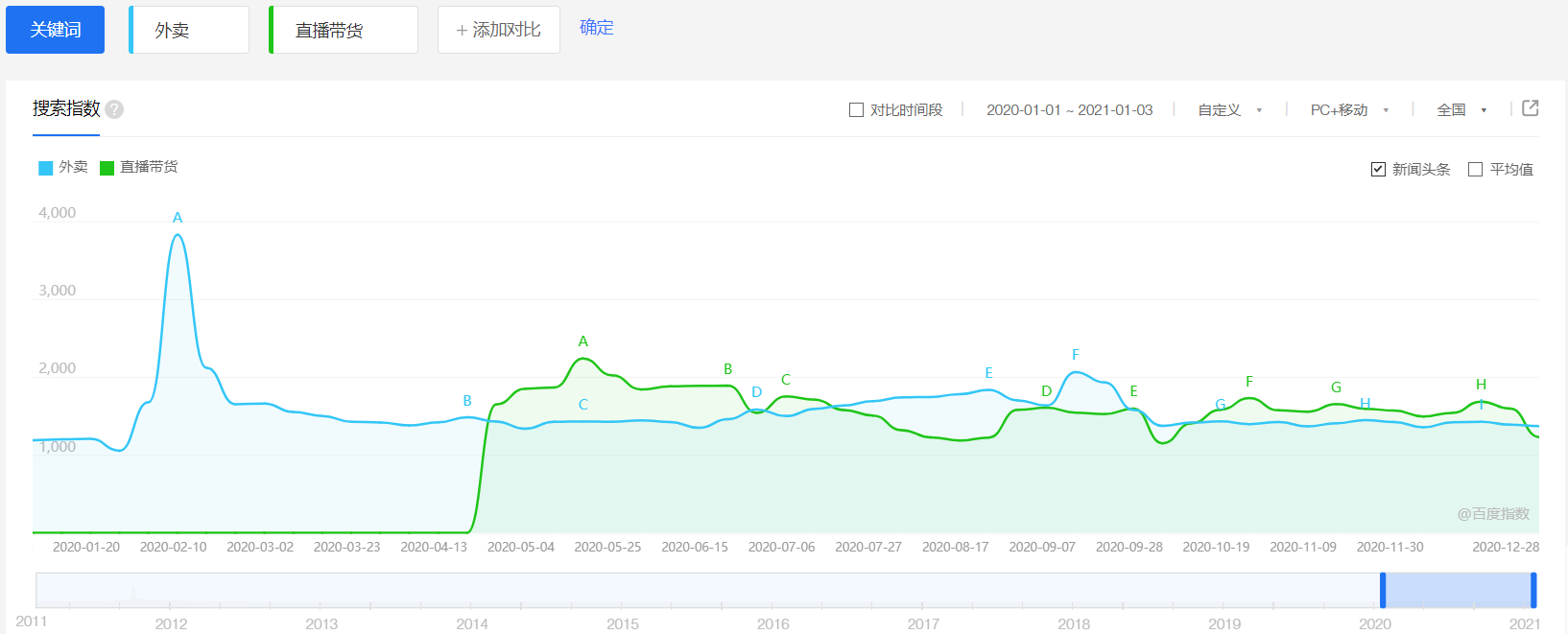 根据实时更新的百度指数可以看到,自2020年2月起“外卖”的百度综合指数达到了均值30%以上的增长;而“直播带货”的百度指数从2020年4月20日空降全网,瞬间形成了现象级的全新零售营销模式,“直播”从小众文化走进大众视野,第一次拥有了广泛的变现渠道。此外,众多诸如线上课堂、远程会议、智能试衣镜、线上个性化产品定制、无接触配送等新概念产品,都因为疫情的因素加速铺开速度,并迅速孵化出完善的产业链条。