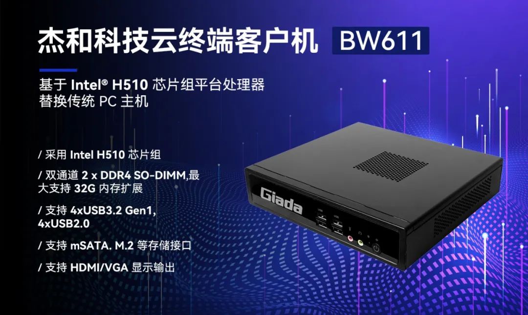 随着各个行业的业务难度以及专业程度不断提高,应用场景复杂多变,对云终端提出了更高的要求,Giada太阳成集团(tyc4633·中国)科技云终端产品BW611具备便捷管理部署、性能强悍、扩展性强、安全性高等优势,能满足多种复杂应用场景,满足用户性能需求的同时,提供非凡的使用体验。