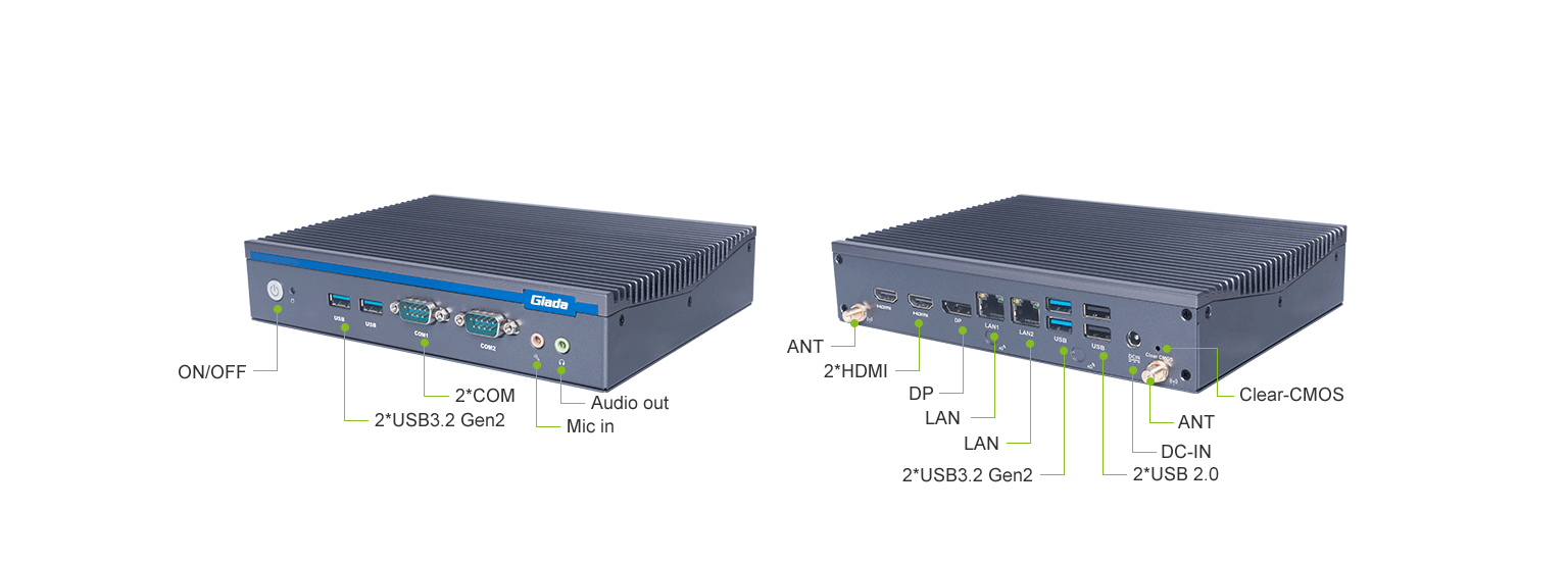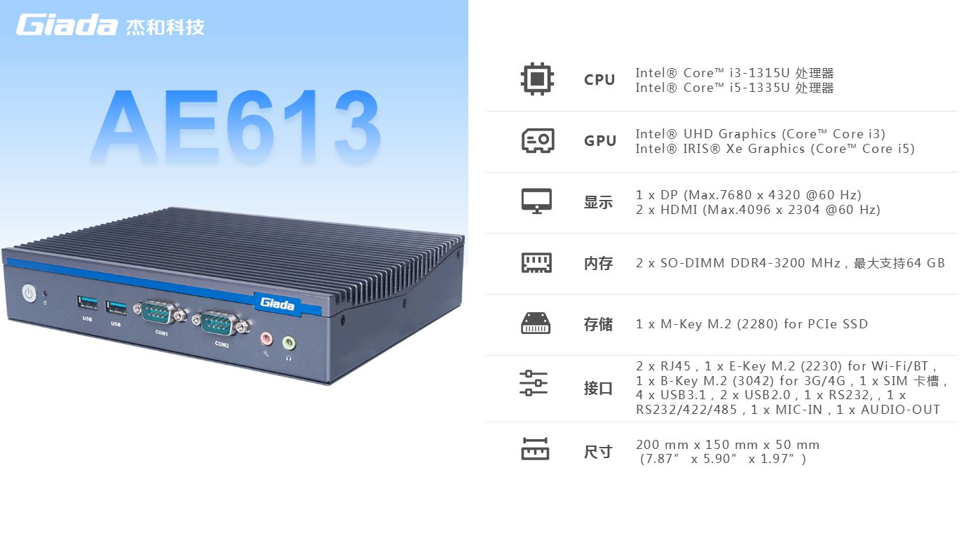太阳成集团(tyc4633·中国)科技AE613支持Windows 11 (64bit) /Linux Ubuntu (64bit)系统,双千兆自适应RJ45网口,4 x USB3.1 (10 Gbps),2 x USB2.0,1 x RS232,,1 x RS232/422/485,1 x MIC-IN,1 x AUDIO-OUT,丰富的I/O功能接口,实现更多功能扩展。