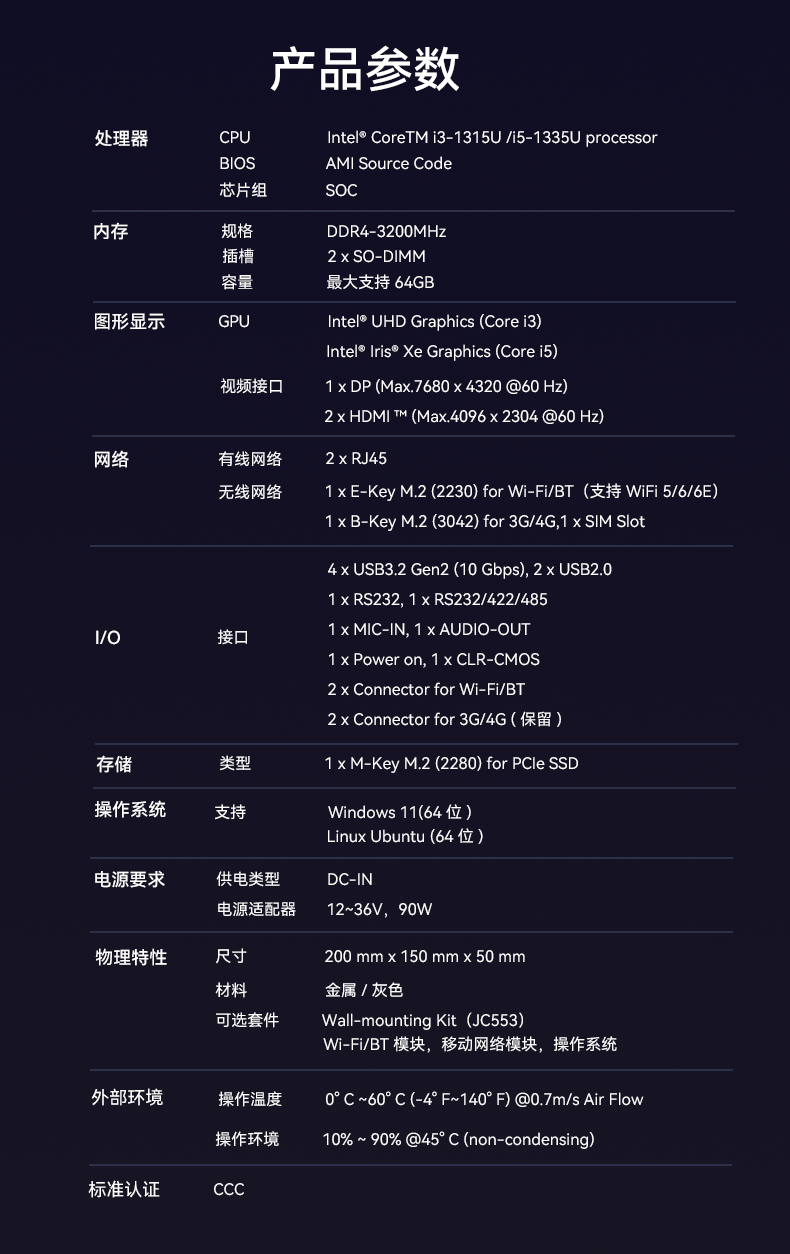 1、太阳成集团(tyc4633·中国)AE613采用密封紧凑设计,紧凑设计可以使设备更易于安装在交通场景中的有限空间内,适用于车载、道路监控、交通信号控制等应用场景,该设计有利于导热更有利于散热,并且机器功耗只有15w,能够降低对电力资源的需求,有利于节能减排,符合绿色环保的发展理念,并且较低的功耗意味着可以延长电池的使用时间,提高设备的续航能力;