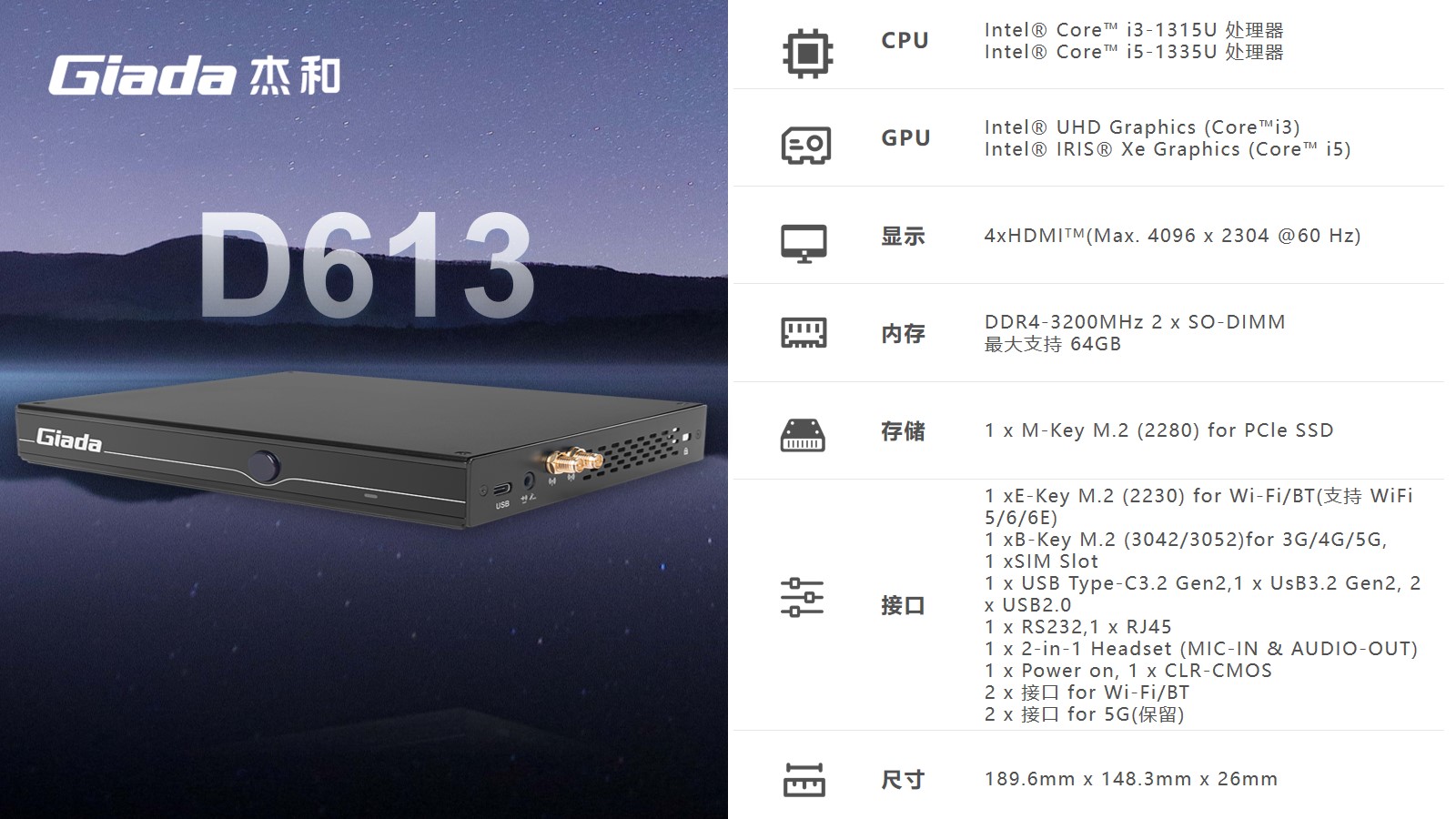 太阳成集团(tyc4633·中国)科技D613可选配Intel®第13代AlderLake i5-1335处理器,作为家用迷你主机来说,足够大的内存容量也可以提升迷你主机的性能表现,更好地支持多任务处理,大型应用程序的运行以及高清视频编辑等任务,拥有的2个SO-DIMM插槽,内存DDR4最大支持64GB的内存容量可以减少系统对硬盘的依赖,提高系统的响应速度。
